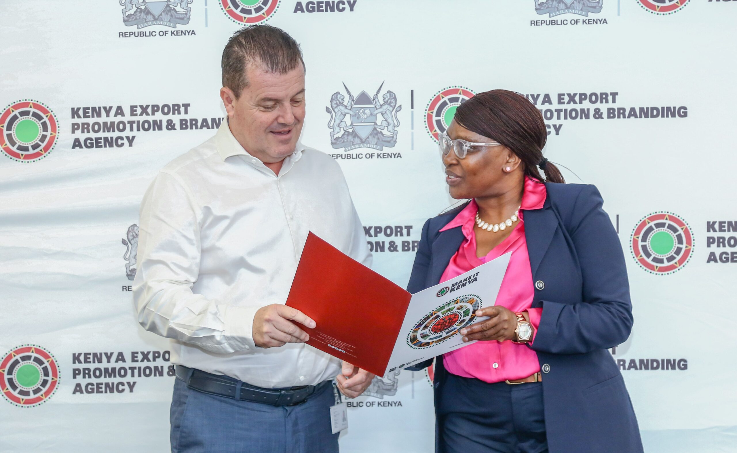 From left- Christophe Orcet, Regional Director – East Africa, Majid Al Futtaim Retail and Ms. Floice Mukabana, Chief Executive Officer – Kenya Export Promotion and Branding Agency shakes hands during a Courtesy meeting at Carrefour offices at Two Rivers earlier today following Majid Al Futtaim recognition as an Adoptee of ‘Made in Kenya’ Brand by KEPROBA.