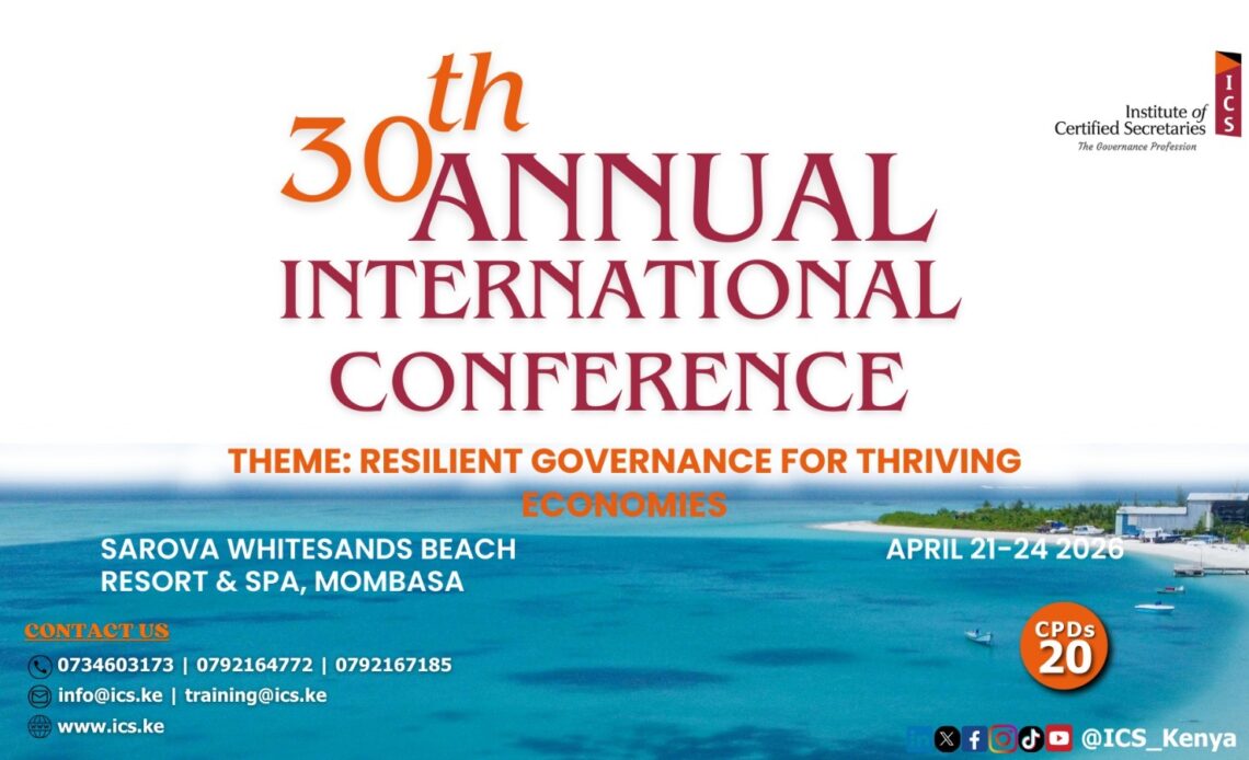 The Institute of Certified Secretaries (ICS) will hold its 30th Annual International Conference from April 21 to April 24, 2026, at the Sarova Whitesands Beach Resort & Spa in Mombasa, bringing together over 300 governance professionals, policymakers, and business leaders.