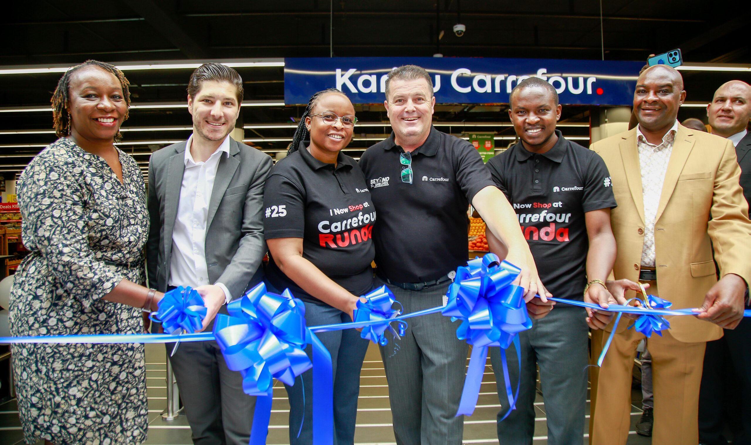 L-R) Wambui Mbarire, CEO of the Retail Trade Association of Kenya; Alexandre Cerqueira, District Manager Supermarkets at Carrefour Majid Al Futtaim; Angeline Bett, Area Manager for Carrefour Kenya; Christophe Orcet, Regional Director – East Africa at Majid Al Futtaim Retail; Fredrick Musyoka, Store Manager Carrefour at Runda Mall; and James Gachiru, owner of Runda Mall, officially cutting the ribbon to mark the grand opening of the Carrefour’s 25th store at Runda Mall